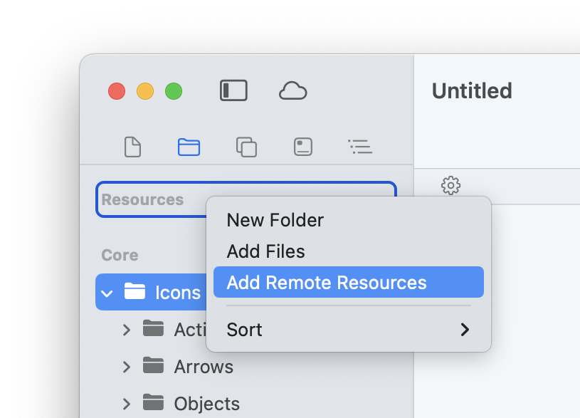 Resources are always manually sorted. However, you can run a one-time sort action to quickly arrange them in a chosen order. To do this, right-click on a Folder in the Resources area and choose a Sort option from the contextual menu. The sort will be applied to the current items in that Folder, but any new items you add (or items you move) will not stay automatically sorted.
