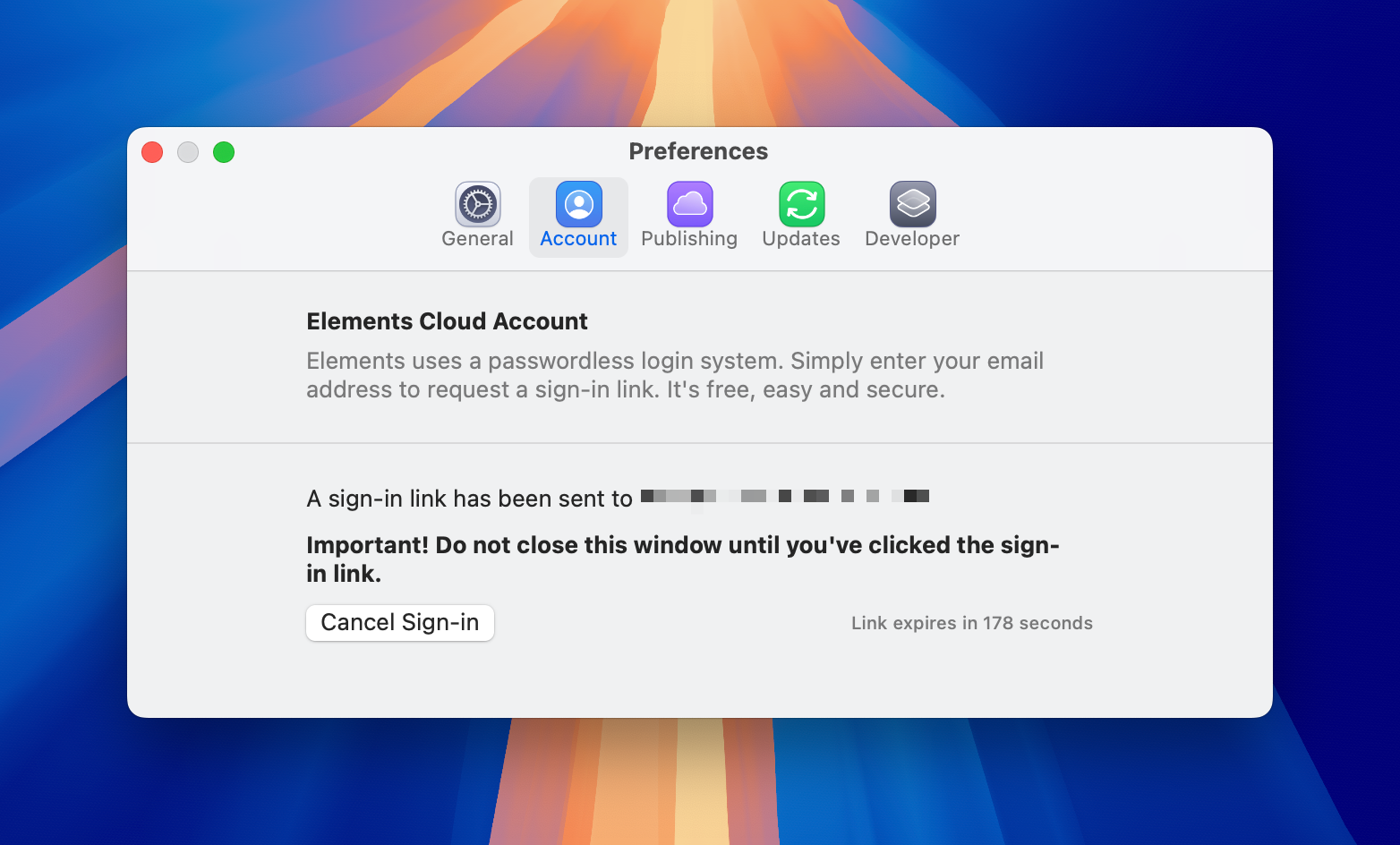 You can sign-up (or sign-in) to your account in the Account Preferences within Elements. Simply enter your email address and click the "Send Sign-in Link" button. An account will be created for you, or you will be logged in (if you already have an account).